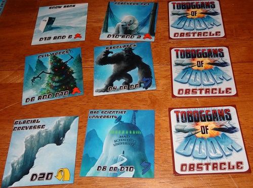 Each player then rolls all but the percentile die in a set of polyhedral dice (D20 or Dungeons and Dragons dice). Toboggans of Doom comes with a set of two but if you’re playing with more than two players, you’ll have to bring more. A set of polyhedral dice—minus the percentile die—is a four-sided die, a six-sided die, an eight-sided die, a ten-sided die, a twelve-sided die, and a twenty-sided die.