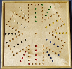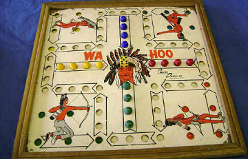 A take on the ancient game of Parcheesi, Wahoo trades Parcheesi’s wooden playing pieces for marbles, and a cloth or cardboard game board for a wooden one with notches whittled out for the marbles to rest. Most of the rules are the same. You roll a single six-sided die and have to get your pieces from your start area to a safe zone.