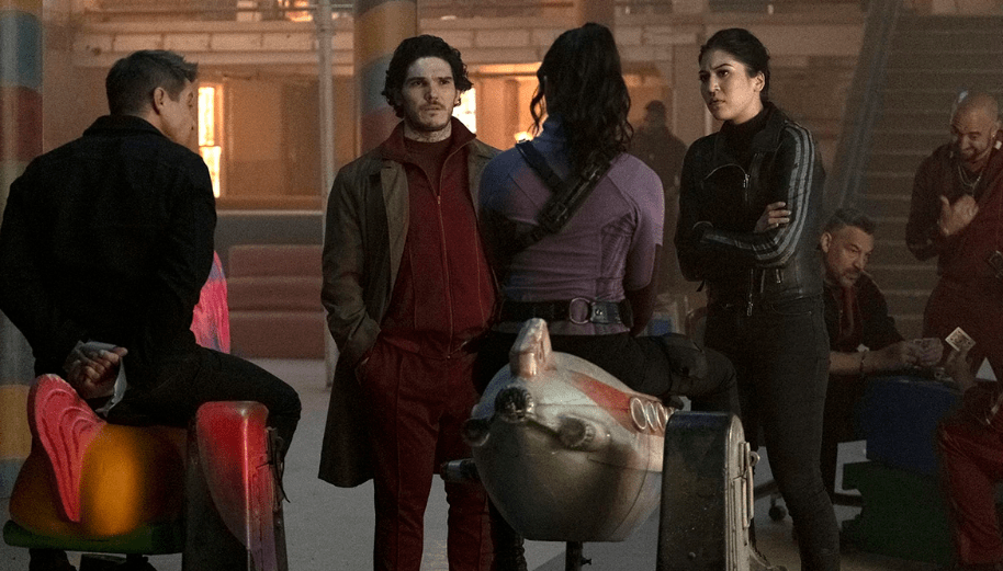 During their get-away, Roxanna mentions the Tracksuit Mafia. This confirms the criminal organization seen in Marvel’s Hawkeye.