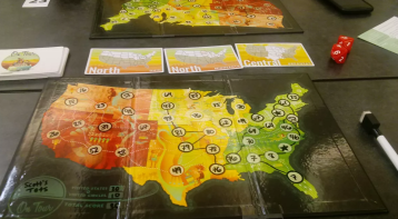 The player boards are two-sided. One side depicts the United States, while the other is a map of Europe. New players should start with the United States. The regions are easier to spot (North, South, East, West, and Central). The straight boundaries of Colorado, Wyoming, and other mid-western and western states help.